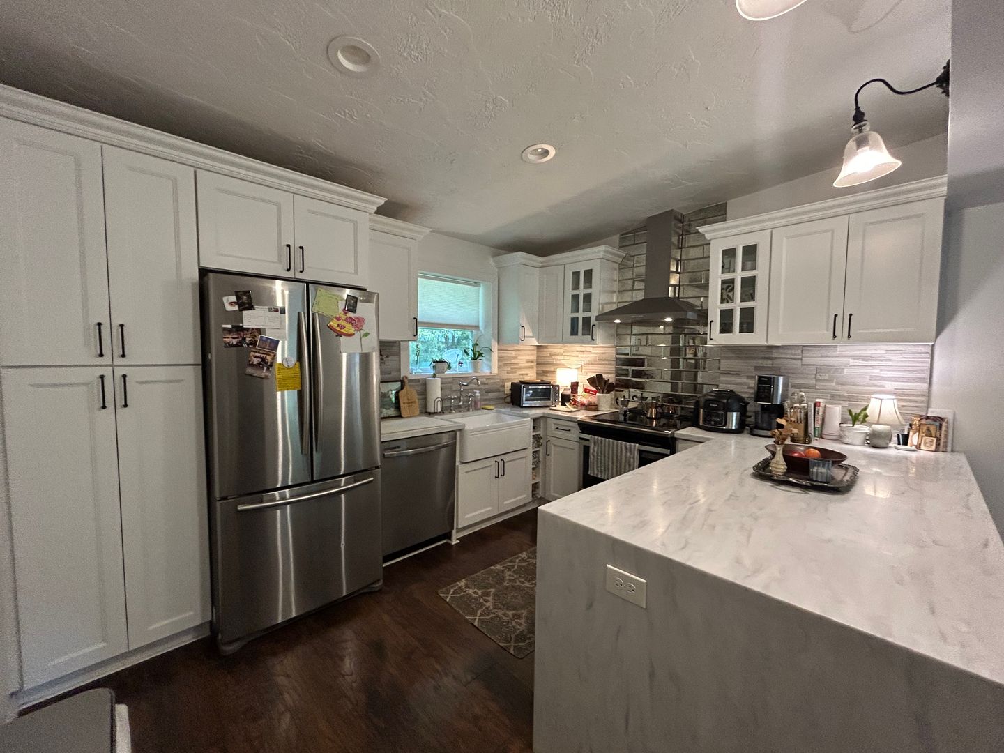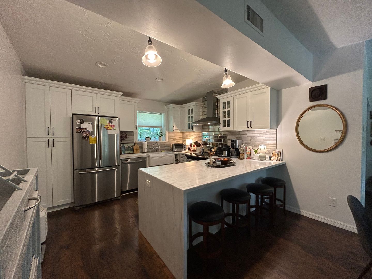 The kitchen is designed for both function and style, offering abundant cabinetry, modern finishes, and a spacious countertop perfect for cooking and entertaining. The split-bedroom layout provides added privacy, with a primary suite that includes its own private entrance.