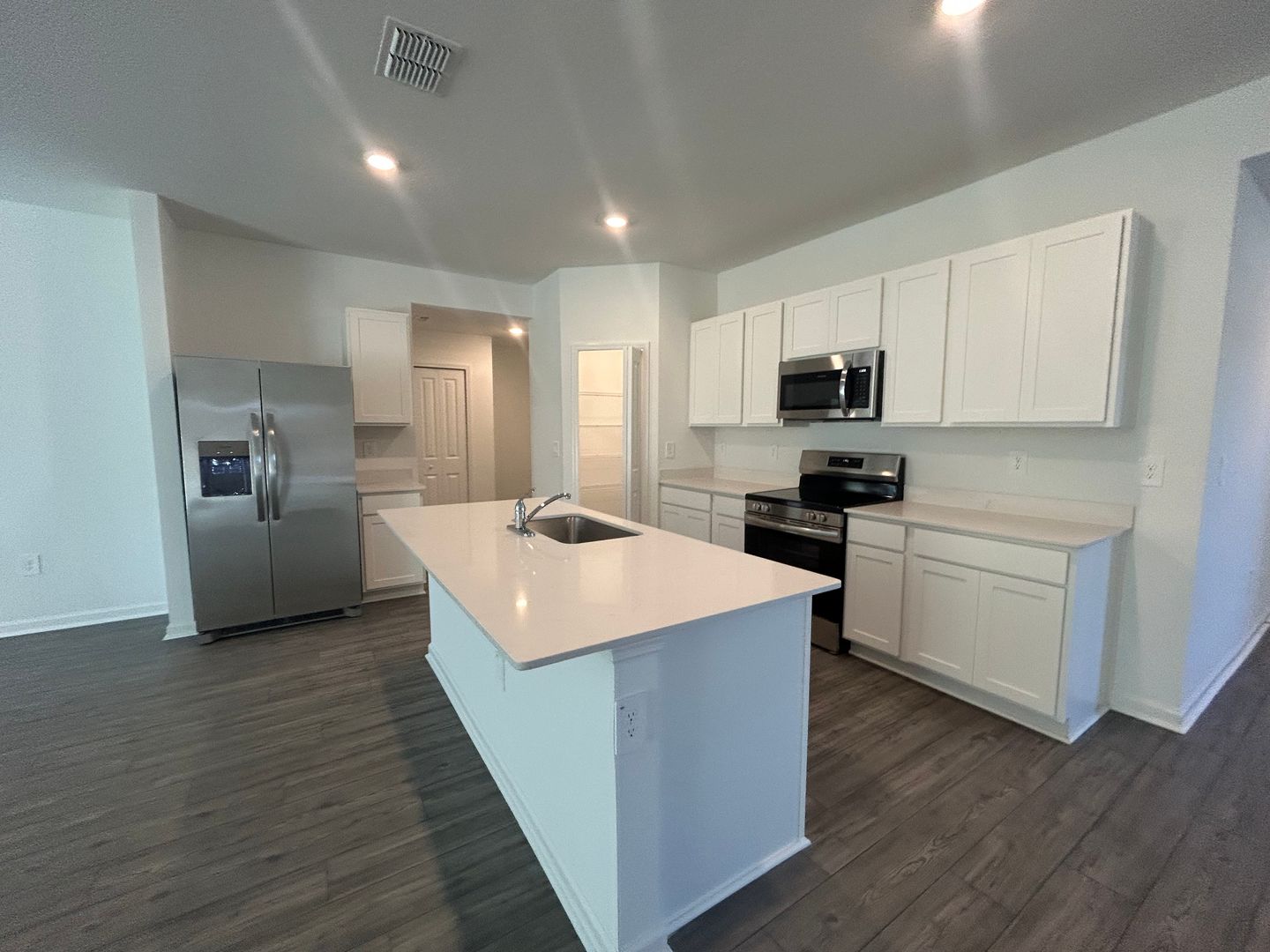 Gourmet Kitchen: The well-equipped kitchen features a center island, durable and stylish quartz countertops, and a full Frigidaire® stainless steel appliance package, including a range, microwave, dishwasher, and disposal.