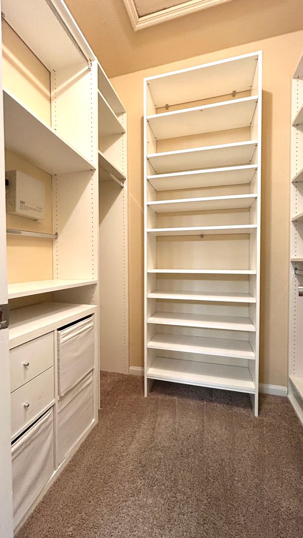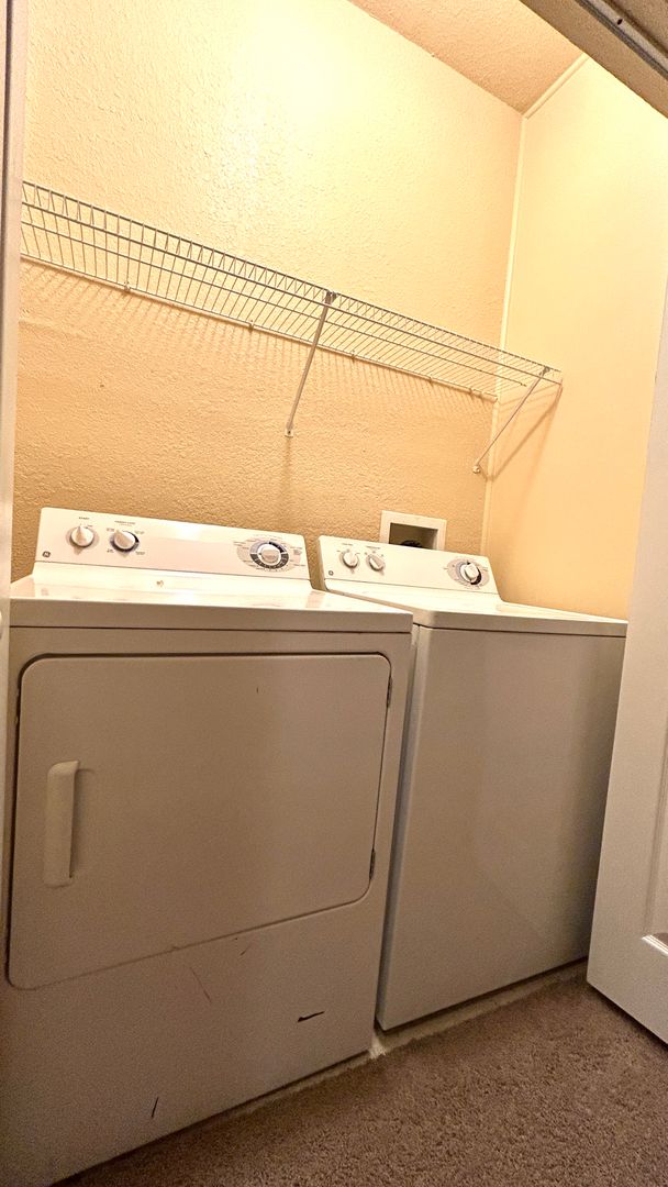 The primary suite includes dual sinks in the bathroom and a generously sized closet with custom built-in shelving, providing excellent storage and organization. A laundry closet is conveniently located upstairs, and the washer and dryer are provided for tenant convenience.