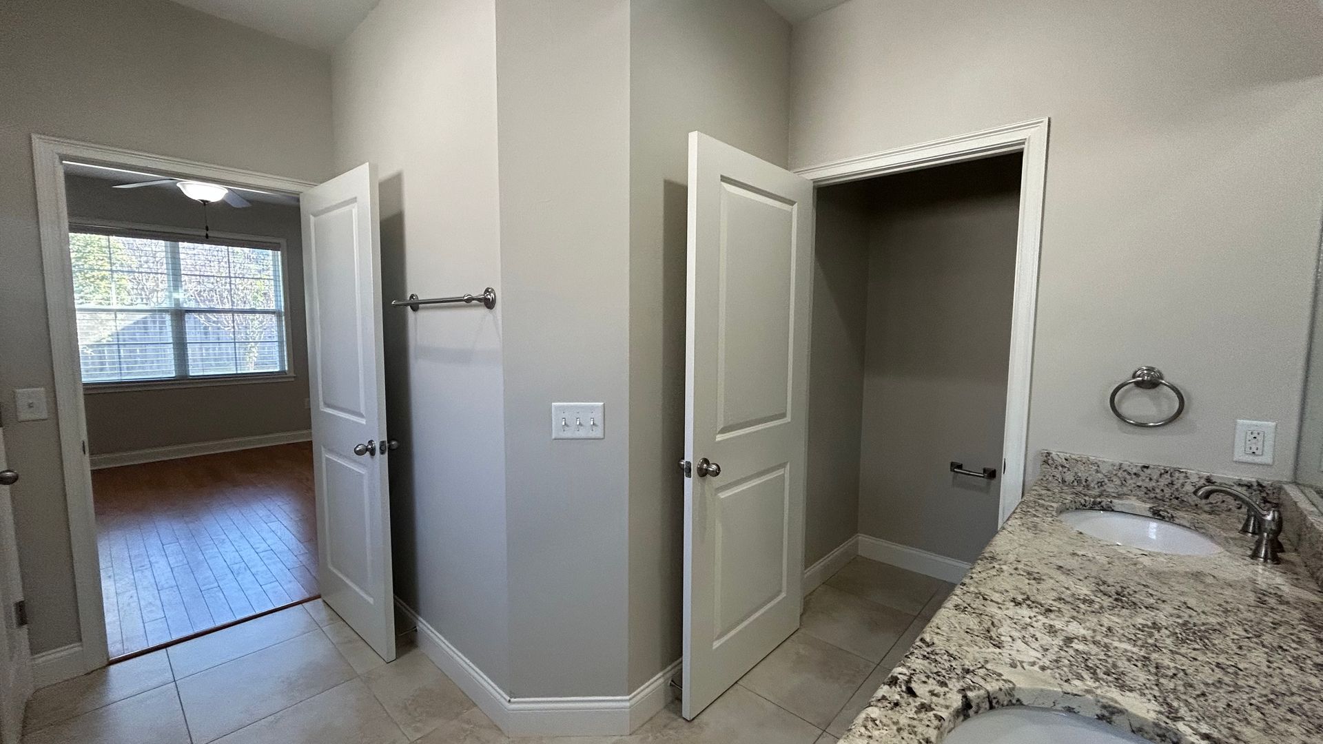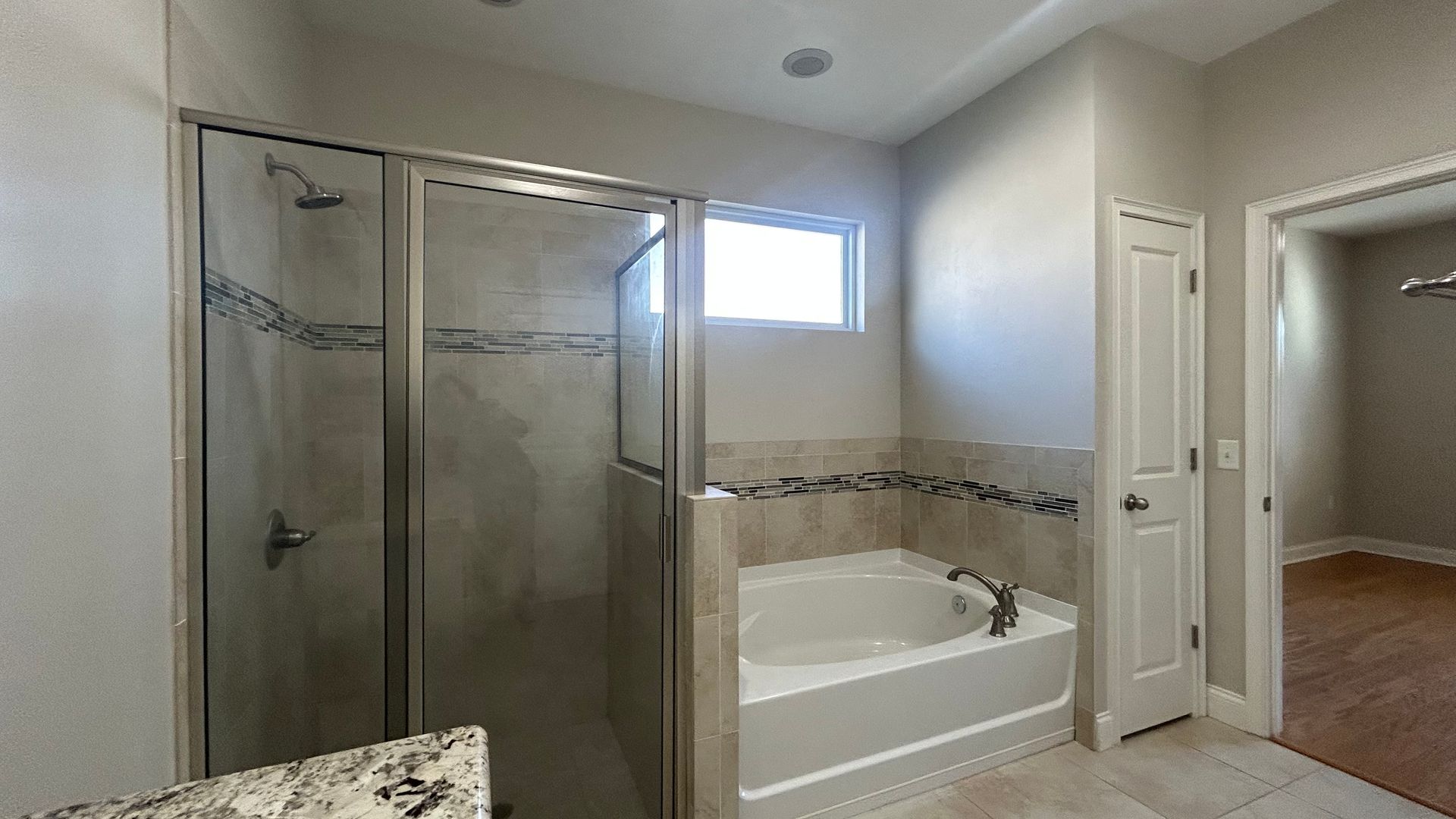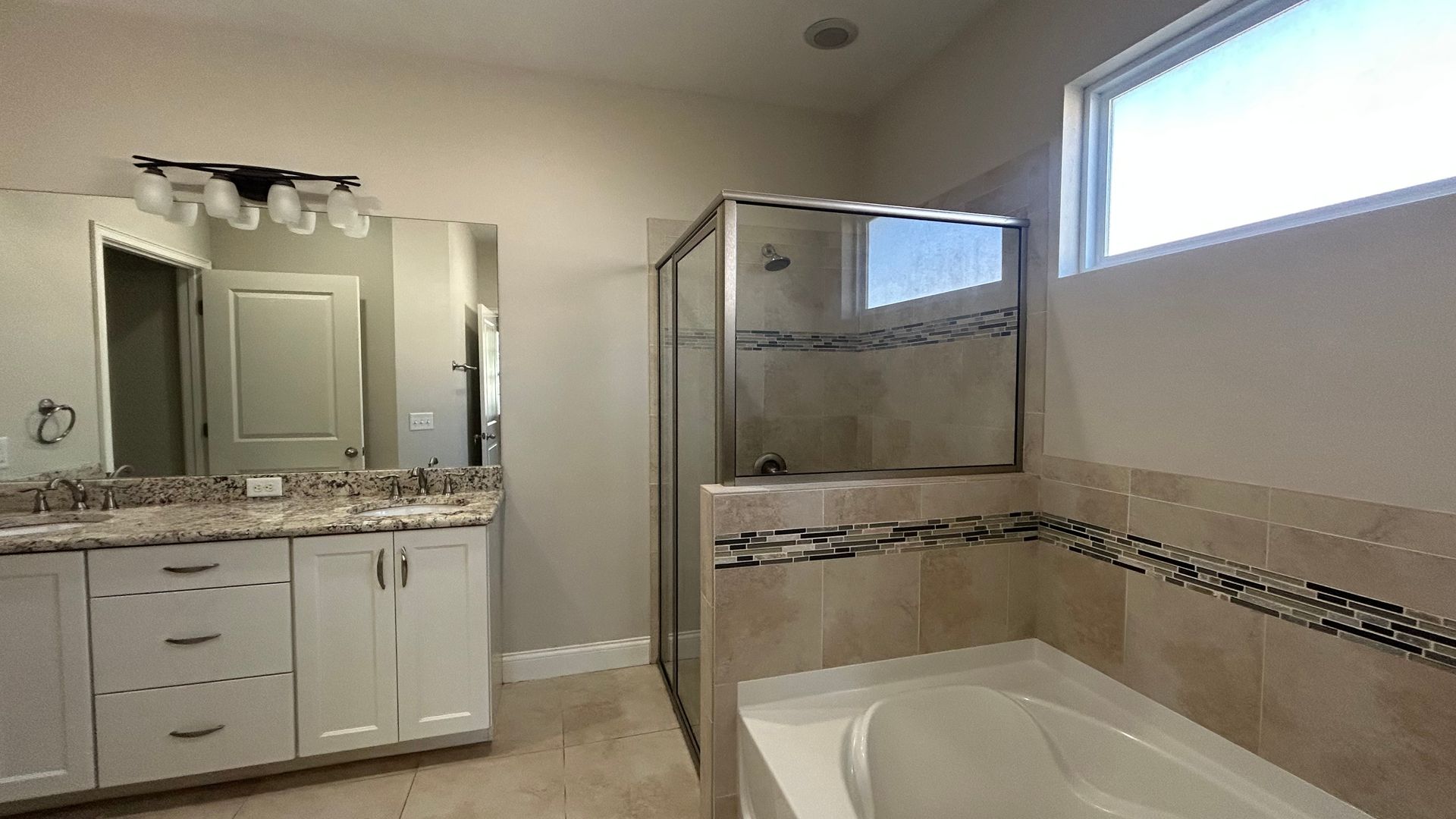 Enjoy cooking in a kitchen equipped with granite countertops, solid wood cabinets with soft-close drawers, a large island with bar seating, and stainless steel appliances (including range, disposal, and microwave). The house is built with energy-efficient features, including a tankless water heater, insulated windows, and central heating and cooling, to help save on utility costs. A spacious primary bedroom on the first level features an en-suite bathroom with a large tub, tiled shower, and dual vanity sinks.