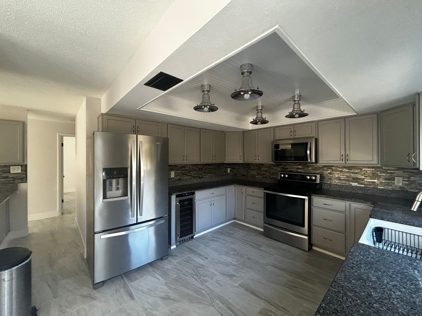 Updates & Amenities: The home is a spacious 5-bedroom, 3-bathroom house featuring an open-concept kitchen with a built-in eating area, two living spaces, an open dining area, and an indoor laundry room. Updates include new vanities, a master suite with a stone walk-in shower, solid surface countertops, and a spacious hobby area in the attached garage.