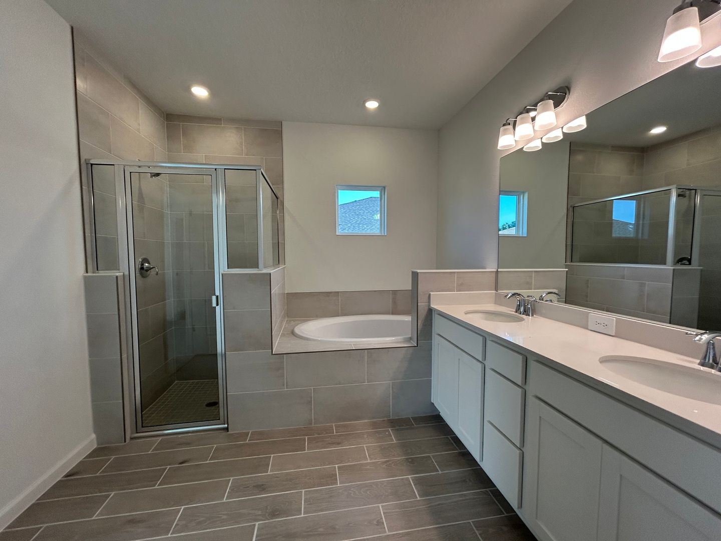 The owner’s suite is a peaceful sanctuary, designed for relaxation and comfort. It boasts a spa-inspired bathroom complete with a soaking tub, split vanities for added convenience, and an oversized walk-in closet to accommodate all your wardrobe needs. This private retreat offers a perfect escape at the end of a busy day.