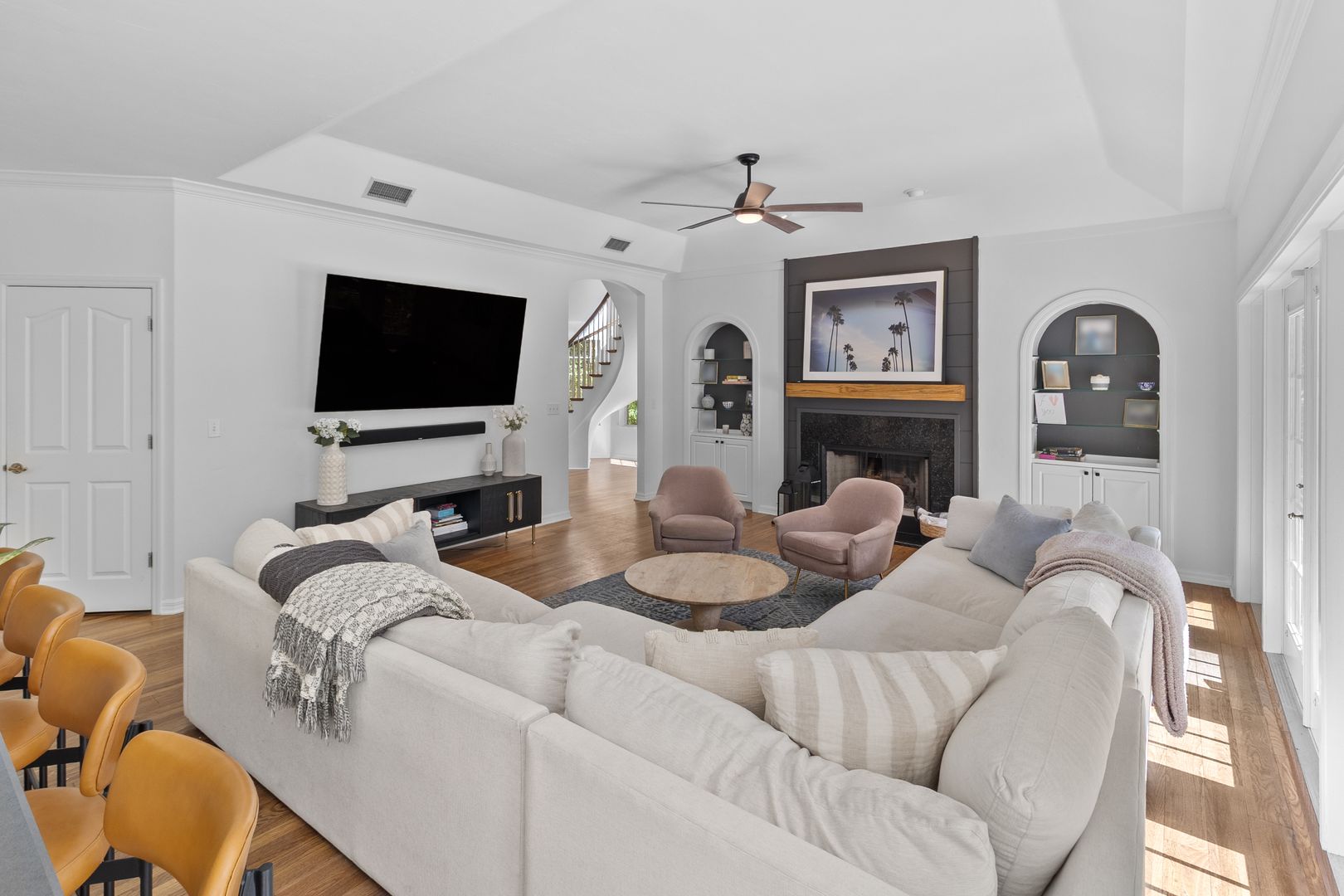 Artistic touches like hand-painted walls and 10-foot tray ceilings add elegance. The open-concept kitchen with high-end appliances flows seamlessly into inviting living areas, ideal for daily life and entertaining.